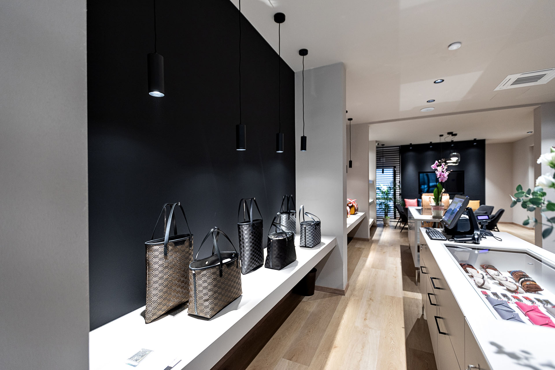 Un arredo geometrico con linee semplici e colori sobri, un effetto di visibilità della sala che coniuga discrezione e allo stesso tempo trasparenza dalla pubblica via, una giusta illuminazione, tutto per valorizzare le lavorazioni di alta classe e l’alta qualità dei materiali dei prodotti esposti. Una boutique dall’atmosfera calda ed elegante, accogliente e moderna.