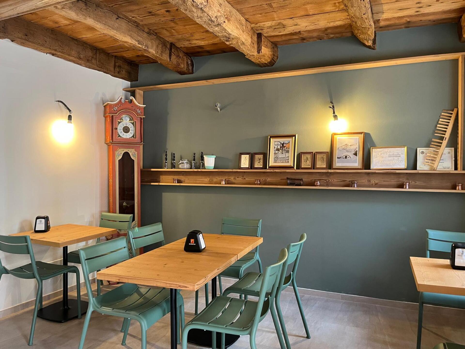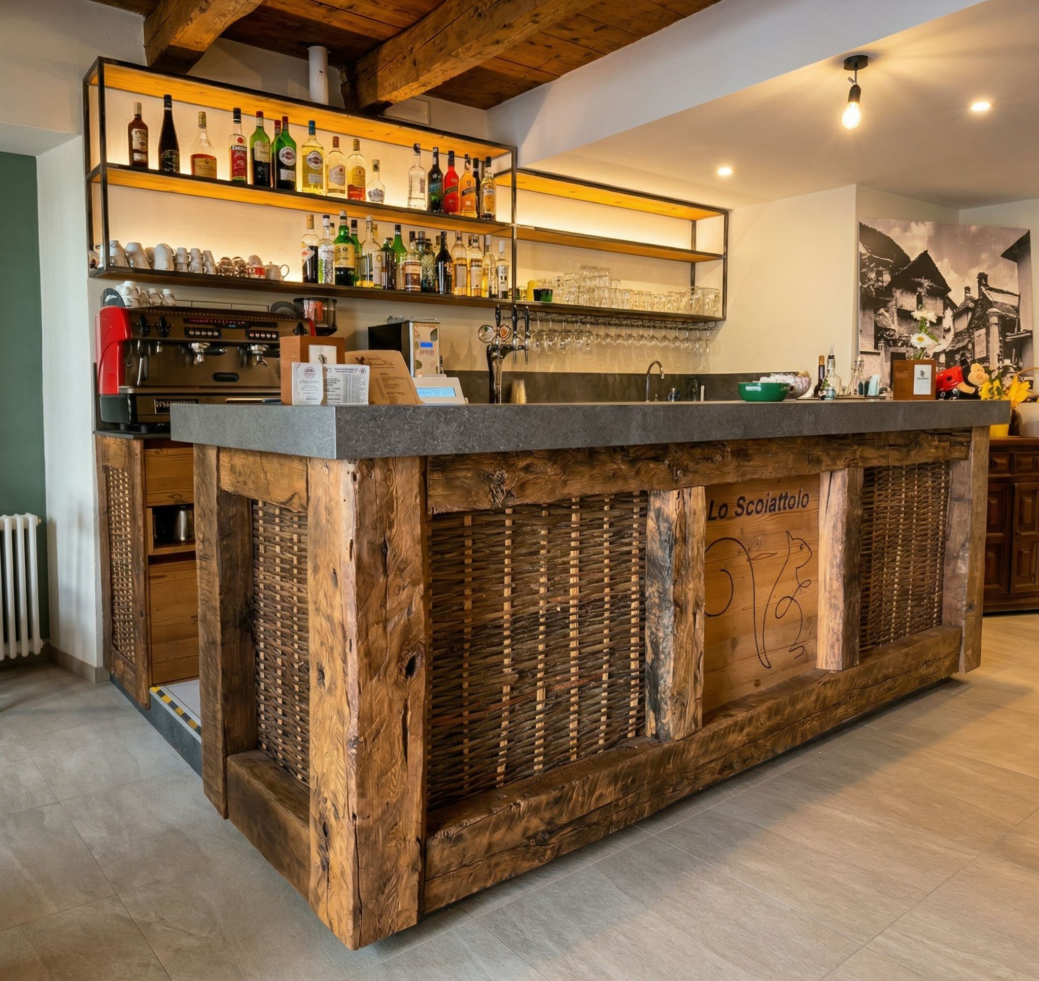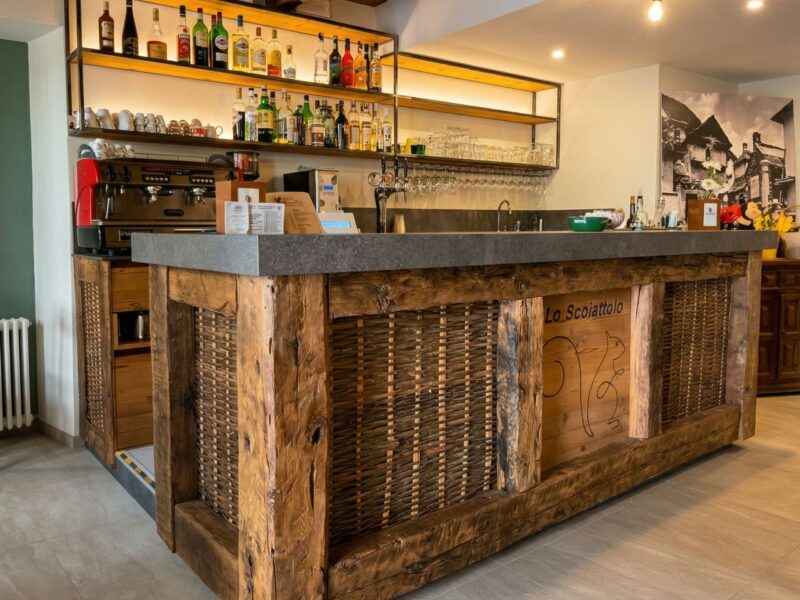 Questo particolare è stato in parte mantenuto e valorizzato applicandone alcuni inserti al fronte del nuovo banco bar, quest’ultimo è stato realizzato con una struttura a cassettoni in antiche travi di legno che riprendono le caratteristiche del vecchio soffitto in travi ed assi in legno appena restaurato.